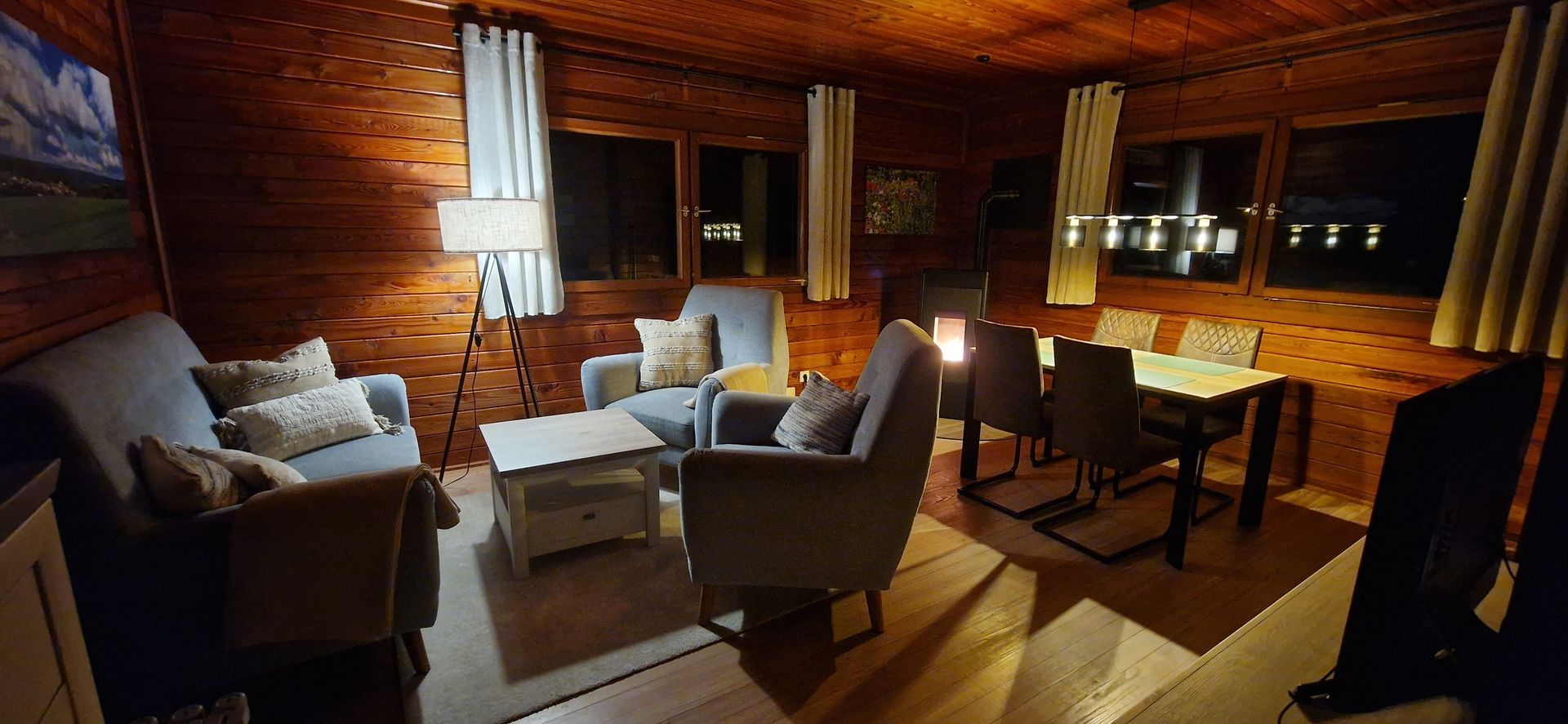 Das Blockhaus wird mit einem hochmodernen Pelletofen beheizt. Dieser erzeugt eine gemütliche Atmosphäre und heizt auch bei Minustemperaturen ausreichend!